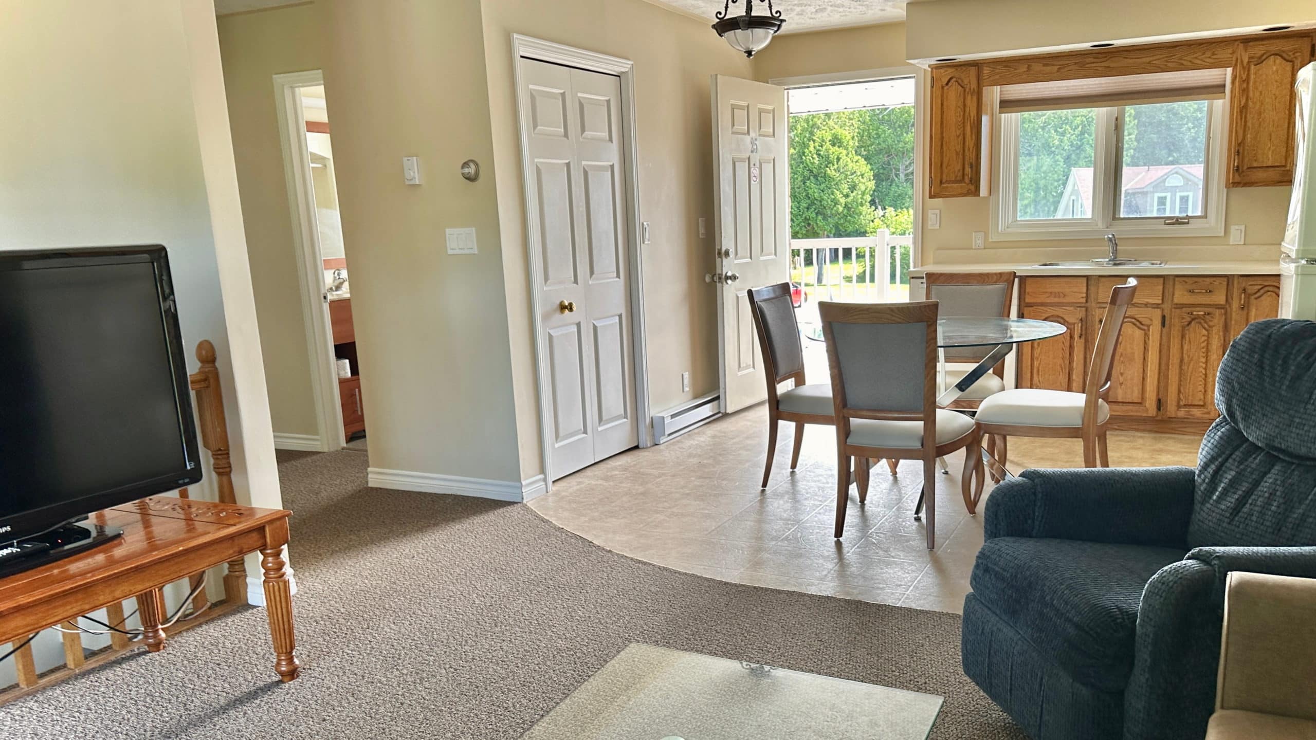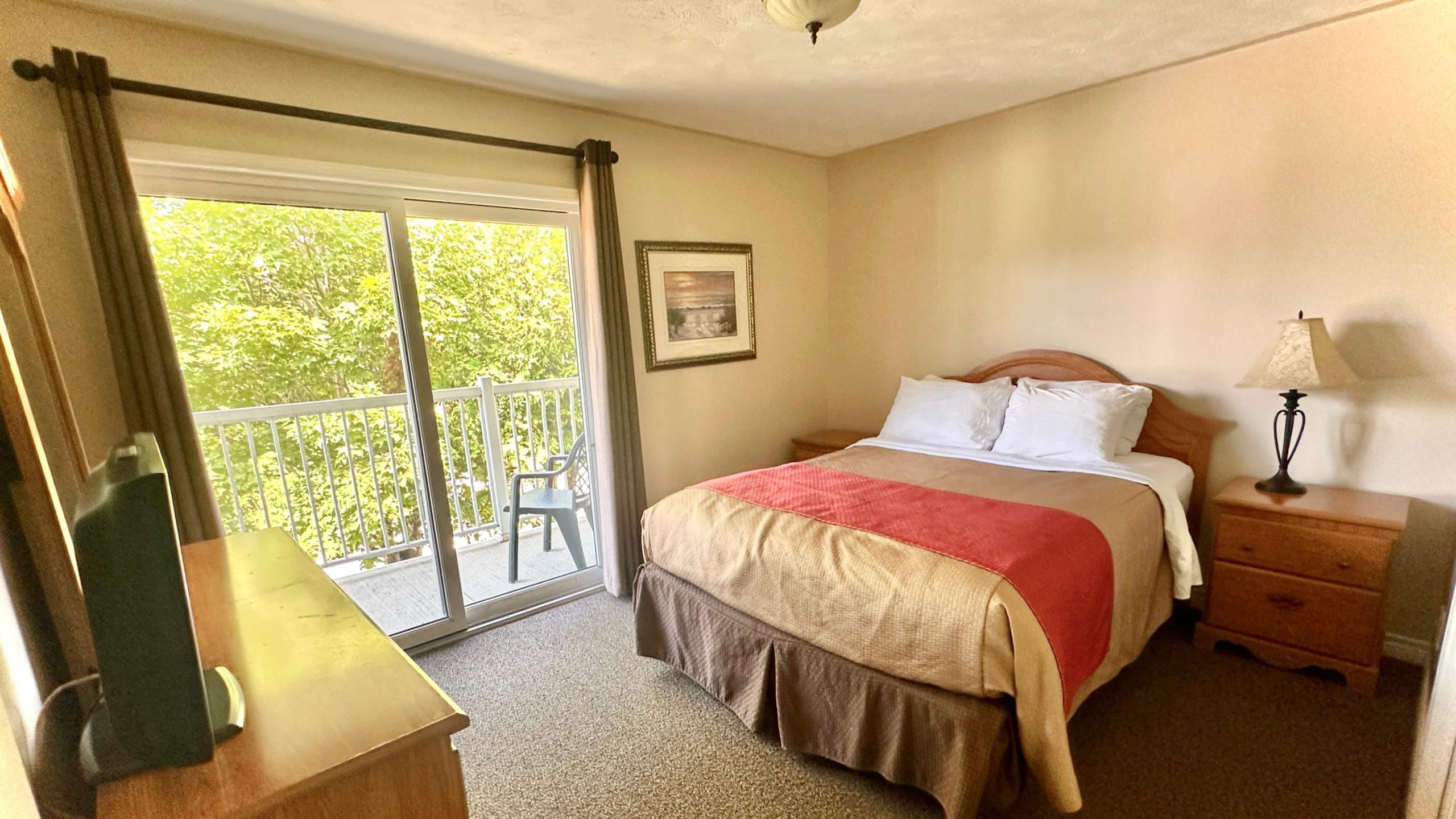 The Bruce Anchor's two bedroom suite can accommodate up to 6 people with each bedroom having one queen size bed, and a pull out couch in the living room. Have more people? Rent a room located next to The Suite and keep your group together! Tastefully decorated and furnished, the suite has all the conveniences of home. Clean, bright and spacious, the two-bedroom suite is on the upper level of the motel. Sliding glass doors from the living room and one bedroom open onto the balcony, a quiet spot to take a refreshing breather or sip your morning coffee while enjoying a glimpse of Georgian Bay across the street. The suite has an eat-in kitchen, complete with beautiful oak cupboards, dishwasher, fridge/freezer, stove/oven, microwave, coffeemaker, toaster and the basic amenities. Each bedroom is furnished with one queen size bed.Stay for a night, a weekend or your summer vacation!